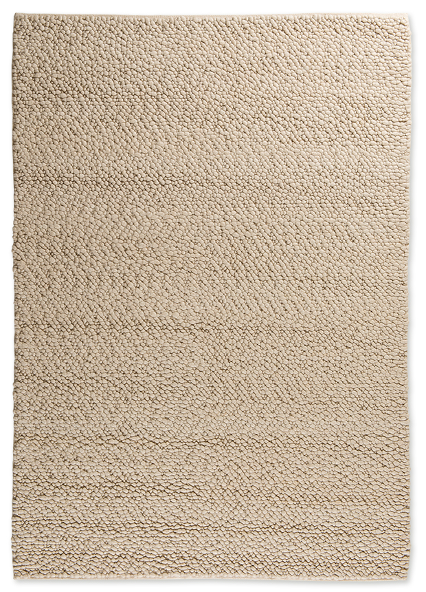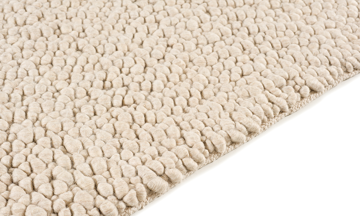 Handwoven rug from 100% wool felt yarns. The loopy rug's are weaved of large, thick and very dense curls creates a pebbled feel.